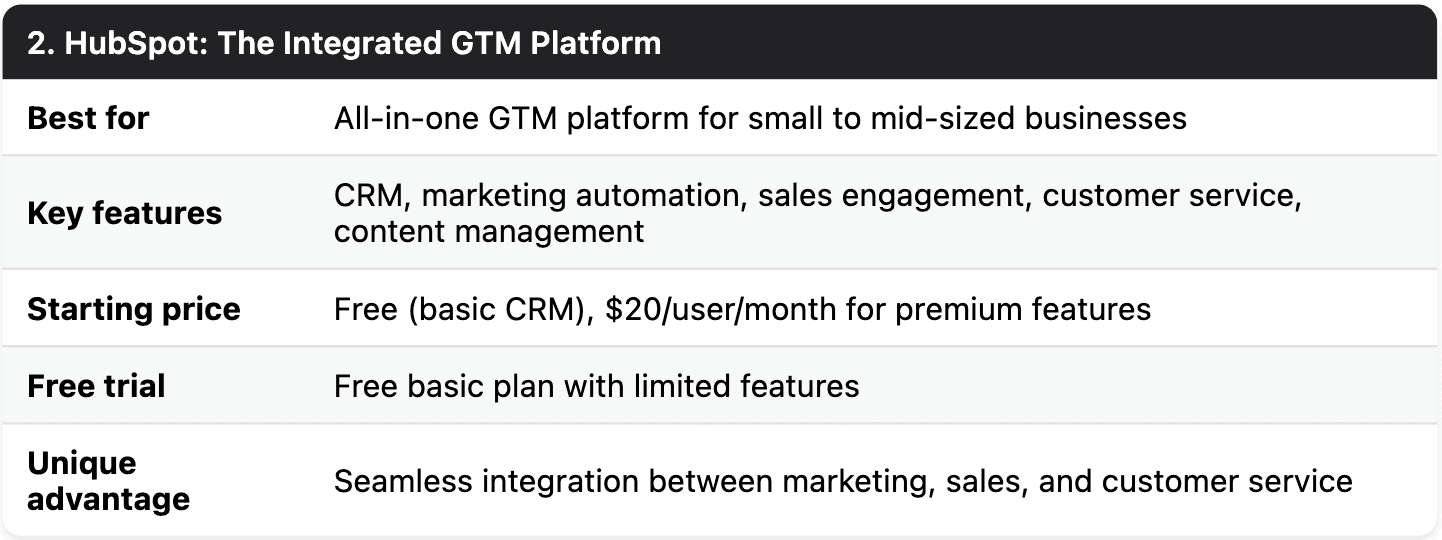 HubSpot remains a cornerstone GTM tool in 2025, primarily because it solves the integration problem that plagues so many GTM stacks. By combining CRM, marketing, sales, and service tools in one platform, HubSpot eliminates data silos and provides a unified view of the customer journey.